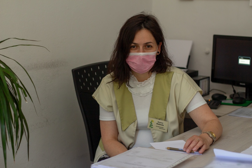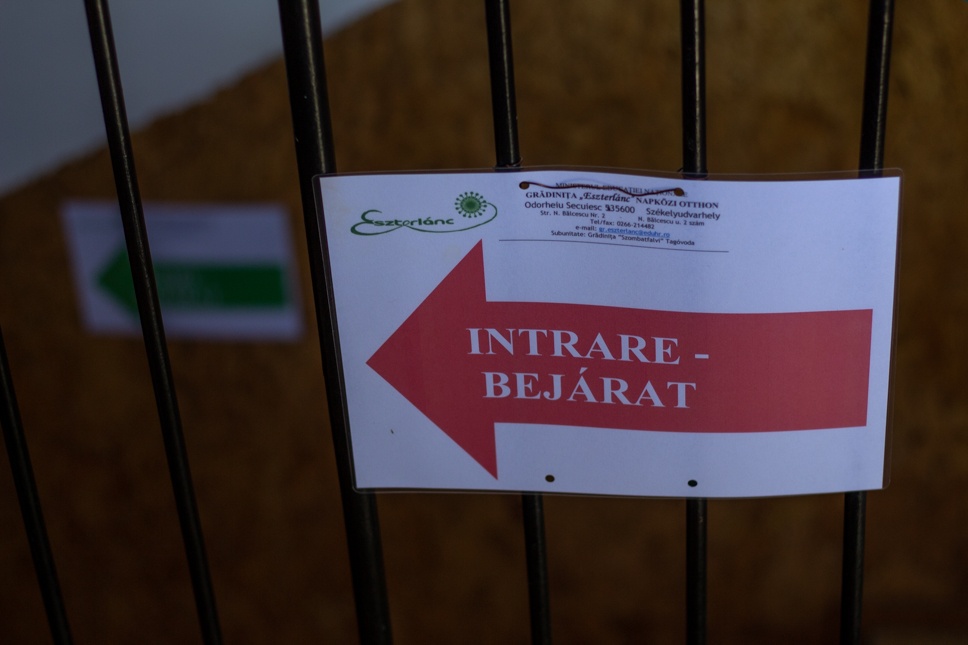 Már az udvaron táblácskák fogadnak: a be- és kifelé utat jelzik a szülőknek, de a szokásos plakátok sem maradnak el, melyek a kézmosásra, a távolságtartásra emlékeztetnek. Az ajtóban egy védőruhás nő fogad, és arra kér minket, hogy használjuk a fertőtlenítő lábtörlőt. Amíg előhalásszuk a maszkokat a táskáinkból, addig megméri a lázunkat, és megmutatja merre találjuk a kézfertőtlenítő adagolót, majd az Eszterlánc Napközi igazgatónőjéhez, Koncz Melindához irányít.