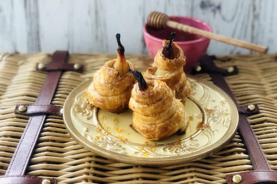 A vízben elkeverjük a cukrot, a mézet és a fél citrom levét. Beledobjuk a fahéjat, a szegfűszeget majd a reszelt tonkababot, és addig forraljuk, amíg a cukor elolvad. Közben a körték alját egyenesre vágjuk, hogy megálljanak a tányéron, majd meghámozzuk úgy, hogy a szárukat rajta hagyjuk. A cukros vízben addig főzzük, míg kellően megpuhulnak. Figyeljünk arra, hogy semmiképp ne főzzük szét őket. A megfőtt körtéket hűlni hagyjuk. Amikor már teljesen kihűltek, a leveles tésztából kis csíkokat vágunk, ezeket tekerjük körbe a körtén. A tojást a tejszínnel (vagy tejjel) és a sóval felverjük, és megkenjük vele a tésztánkat, hogy szép aranybarna legyen. 200 fokos sütőben 20-25 perc alatt megsütjük.