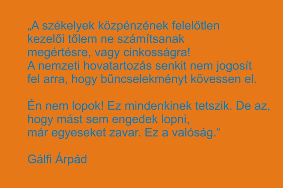 A polgármester szónoki képe mellett egy idézet: „Csak azok az emberek lesznek dühösek az igazságot hallva, akik hosszú ideje hazugságban élnek”. (Gálfi Árpád)