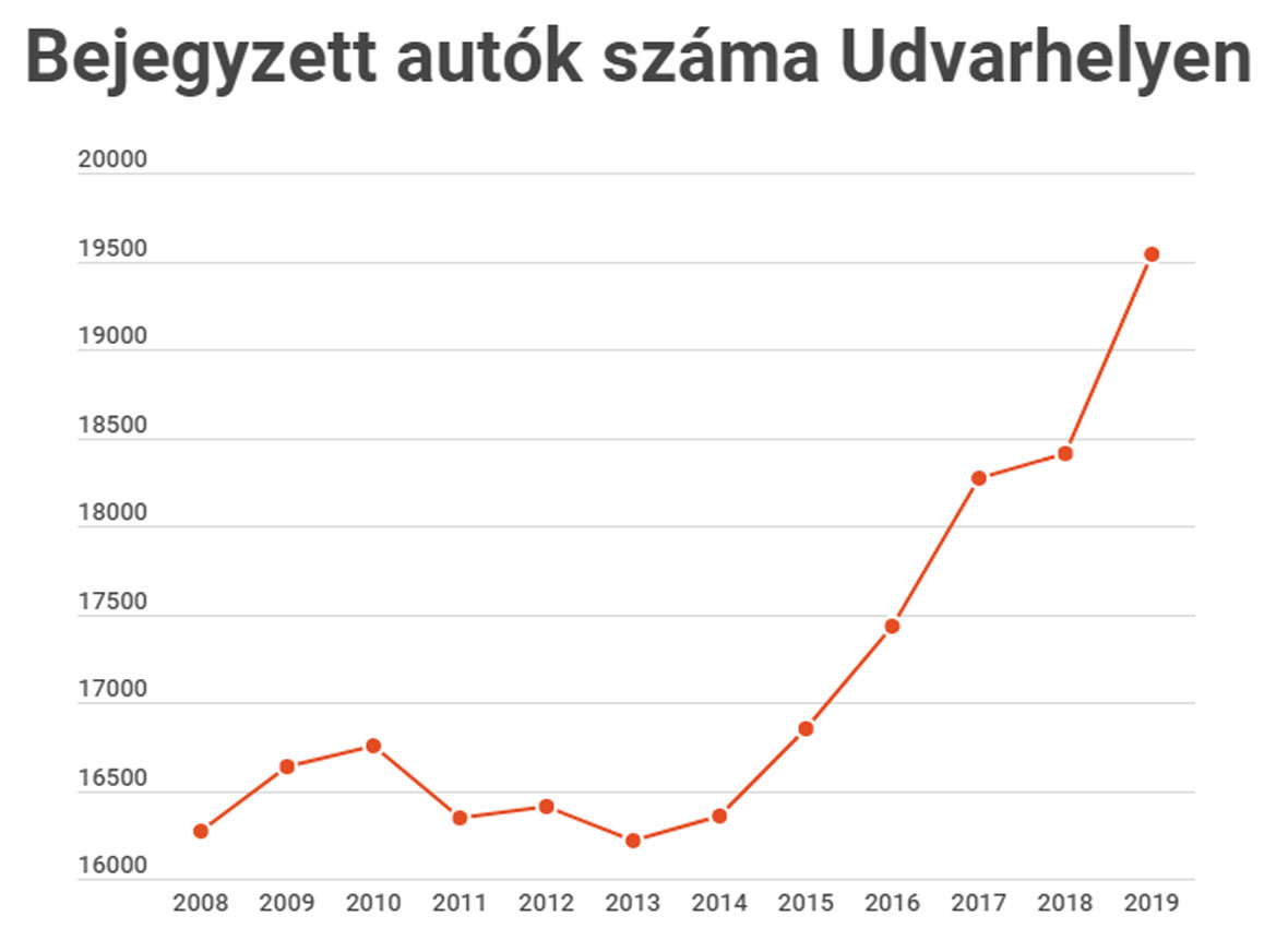Városunkban jelenleg 19543 gépjármű van bejegyezve, 14328 van magánszemélyek és 5215 jogi személyek tulajdonában. Udvarhelyen 12500 háztartással számol a hivatal, így gyakorlatilag egy háztartásra 1,56 autó jut.