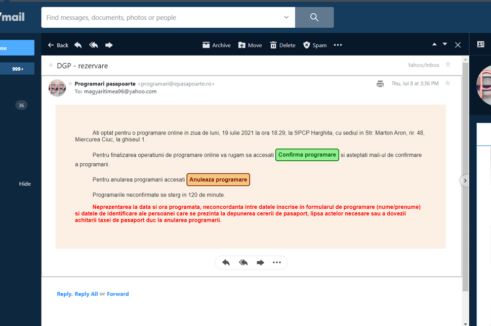 Ezután még egy ímélt küldenek egy kóddal, amit állítólag kérni fognak a helyszínen. Tőlem nem kérték, de azért jó, ha leírod valamire, vagy előkészíted az ímélt, szükség esetére. Ha meggondolnád magad, ugyanebben az ímélben tudod törölni a foglalásod, ha az Anuleaza programare gombra kattintasz.