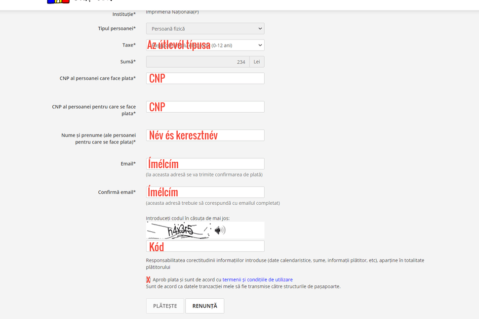 Először a Taxe ablaknál kell kiválasztanod ugyanazt a dokumentumtípust, amit már korábban is, alatta automatikusan kitölti, hogy mennyibe fog kerülni. Majd következik a CNP kétszer, a neve és a keresztneve annak a személynek, akinek lesz az útlevél, és az ímélcím kétszer. Ha kiböngészted a girbe-görbe kódot, már csak azt kell beikszelned, hogy jóváhagyod a fizetést, egyetértesz a felhasználási feltételekkel, és jöhet is a fizetés (Plătește).