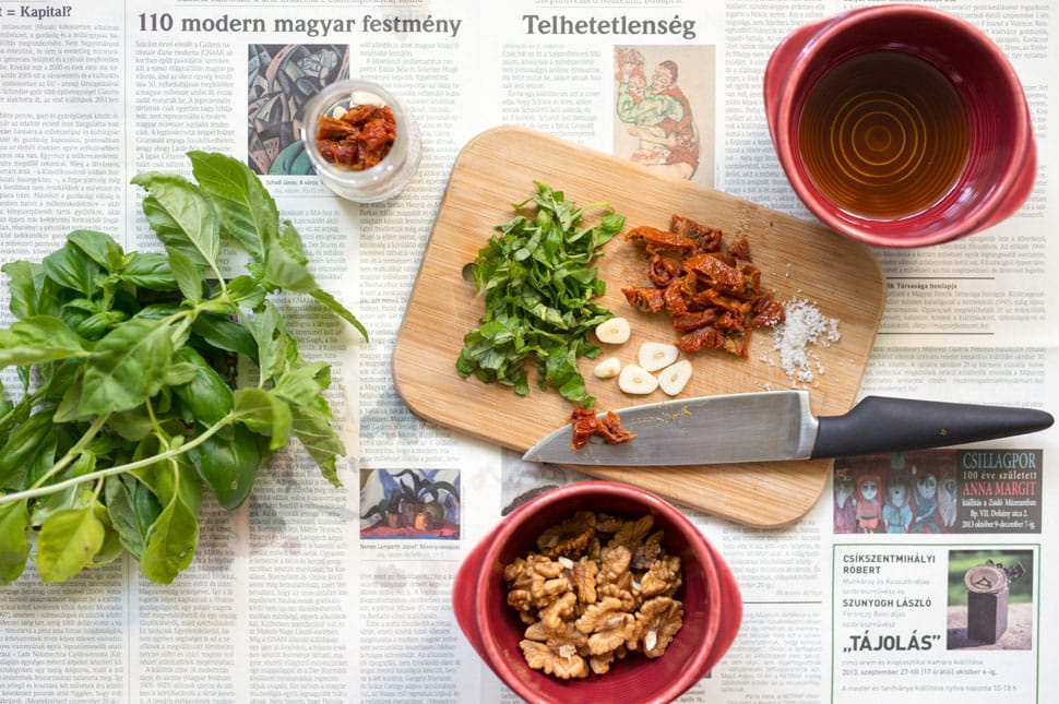 Amikor fáradtan érkezel a műszak után, és tudod, hogy nincs otthon semmi, éppen jó lesz. Mivel az alapunkból kihagytuk a fenyőmagot, utólag tehetünk bele, de használhatunk diót is. Ezt aztán kenheted a sajtodra, a szendvicsedbe, a sültcsirkédre, de készíthetsz egy jó pastat is belőle. Egyszerűen rákened, vagy Gombóc Artúr módjára jöhetnek az ötletek: pirított mogyoróval, dióval, ha frissességet keresünk, egy fél citrom levével, de összezúzhatjuk krémsajttal, ricottával, mascarponeval, tejszínnel, sőt főzhetünk egy besamelmártást is hozzá és így tovább.