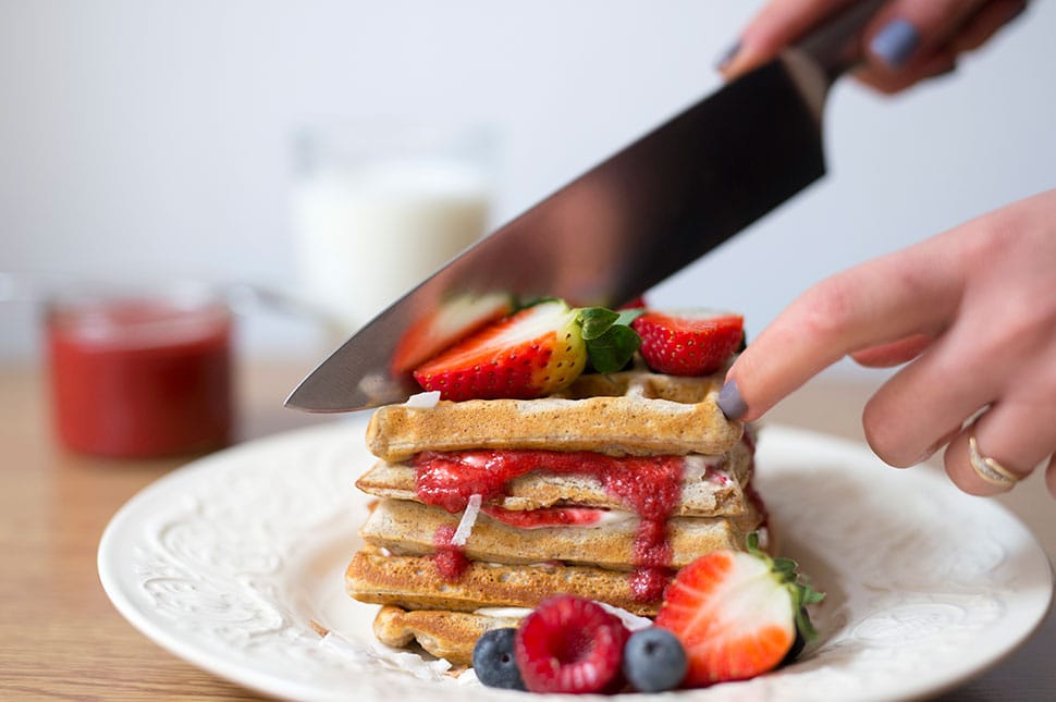 Ha kész a gofri, akkor megkenjük a krémünkkel, a friss eperszósszal, majd jöhet egy újabb gofri, krém, lekvár és így tovább. A reggelinket friss gyümölcsökkel, kókuszchipssel, magvakkal tálaljuk.