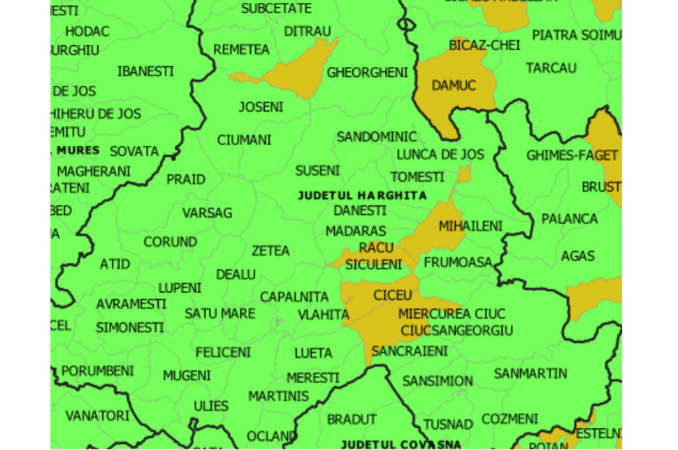 Hargita megyében egyelőre nincsenek vörös zónák, viszont sárga van, nem is egy. A Közegészségügyi Intézet térképén és táblázatán látszik, hogy a Csíki-medence jelentős része besárgult, a következő településekben haladták meg az 1000 főre eső 1 betegszámot: Csíkszereda (1.25), Csíkcsicsó (1.04), Csíkrákos (1.83), Csíkszentmihály (1.09). Gyergyószékről egyetlen településen, Gyergyószárhegyen ment a küszöb fölé az index, itt 1.11-et számoltak.