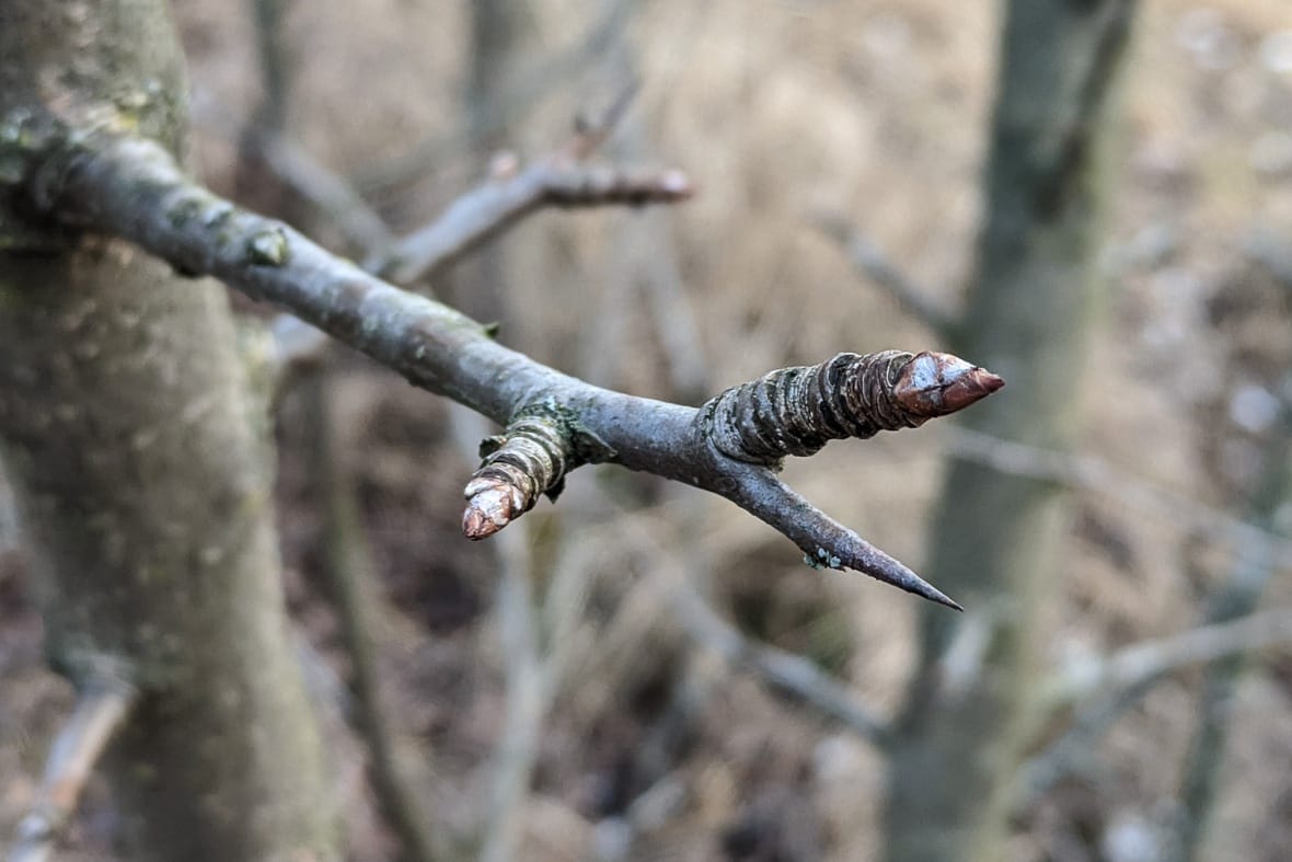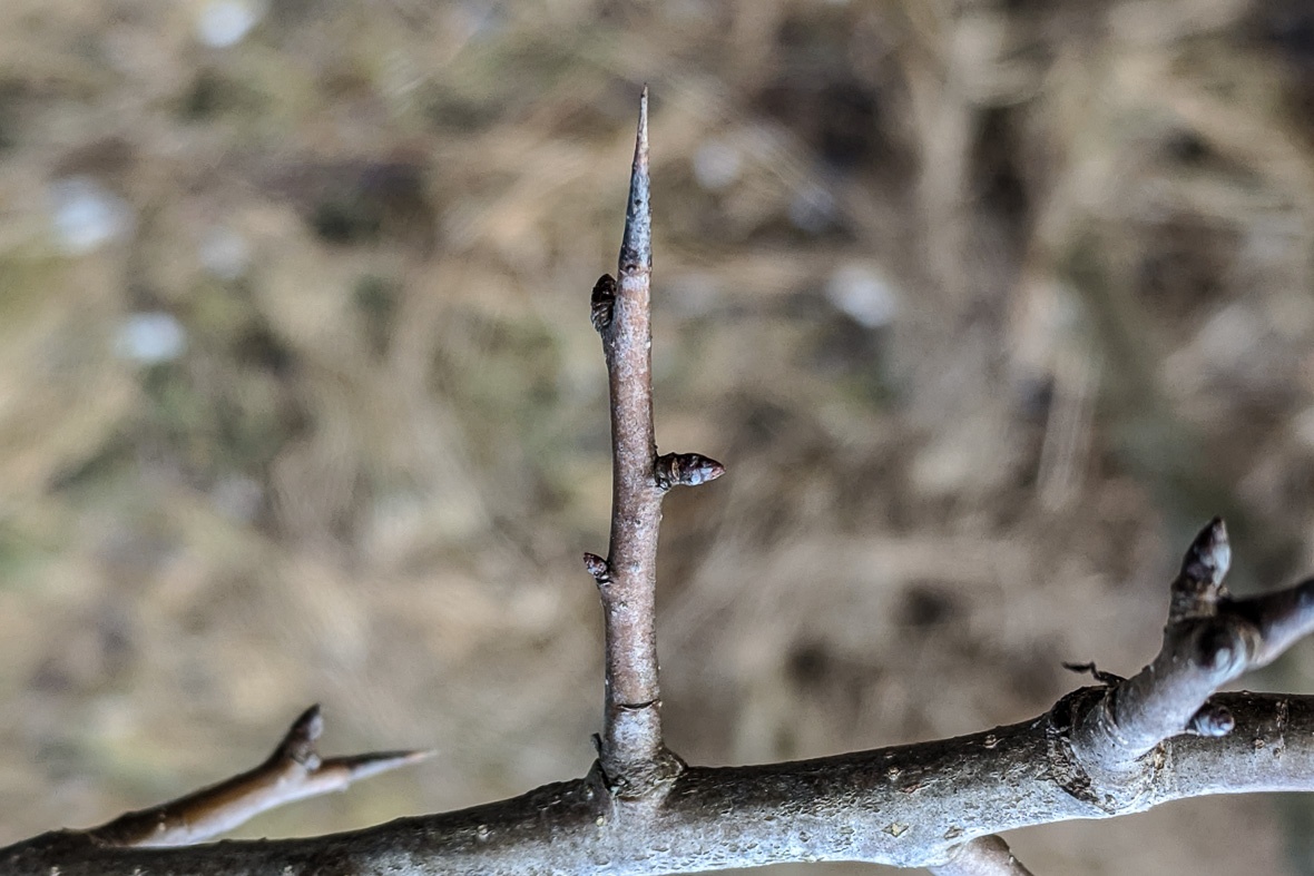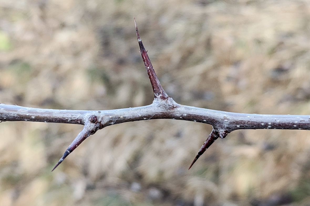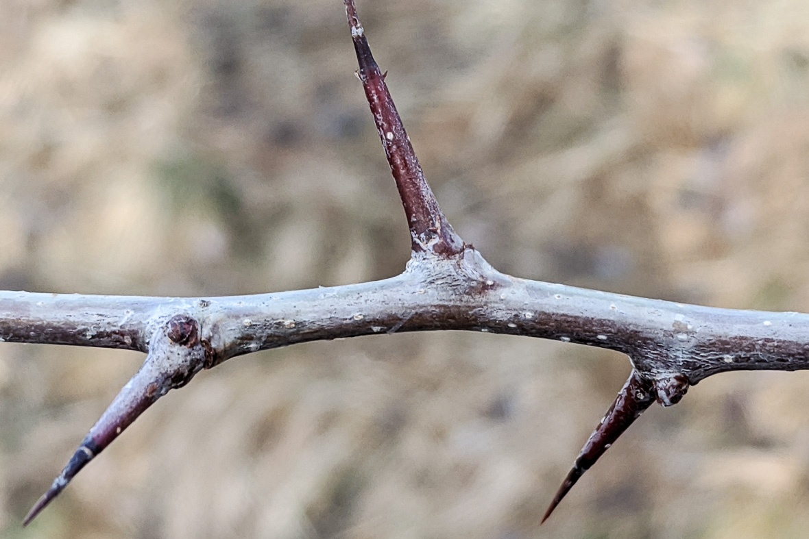 Aránylag rövid és izmos tövisei vannak, a végük hegyes, rajtuk nincs rügy. Minden tövis tövében ellenben található egy bokaszerűen kiálló rügy. Egy nagy. A képen nem látszik, a középső tűnek is van bokarügye, csak a túlsó oldalon. A vesszőn mindig ugyanazon az oldalon van a tövisek rügye, ahogy haladunk kifelé, a jobb oldalon. Ezek a rügyek aztán később, ahogy közeledünk az oltási szezonhoz, megpirosodnak, erről nagyon könnyű felismerni a galagonyát. És egyébként sem könnyű összetéveszteni a vadkörtével vagy vadalmával, mert kisebb termetű, zömökebb, és sokkal világosabb a kérge. A rá oltott nemes is kisebbet nő.