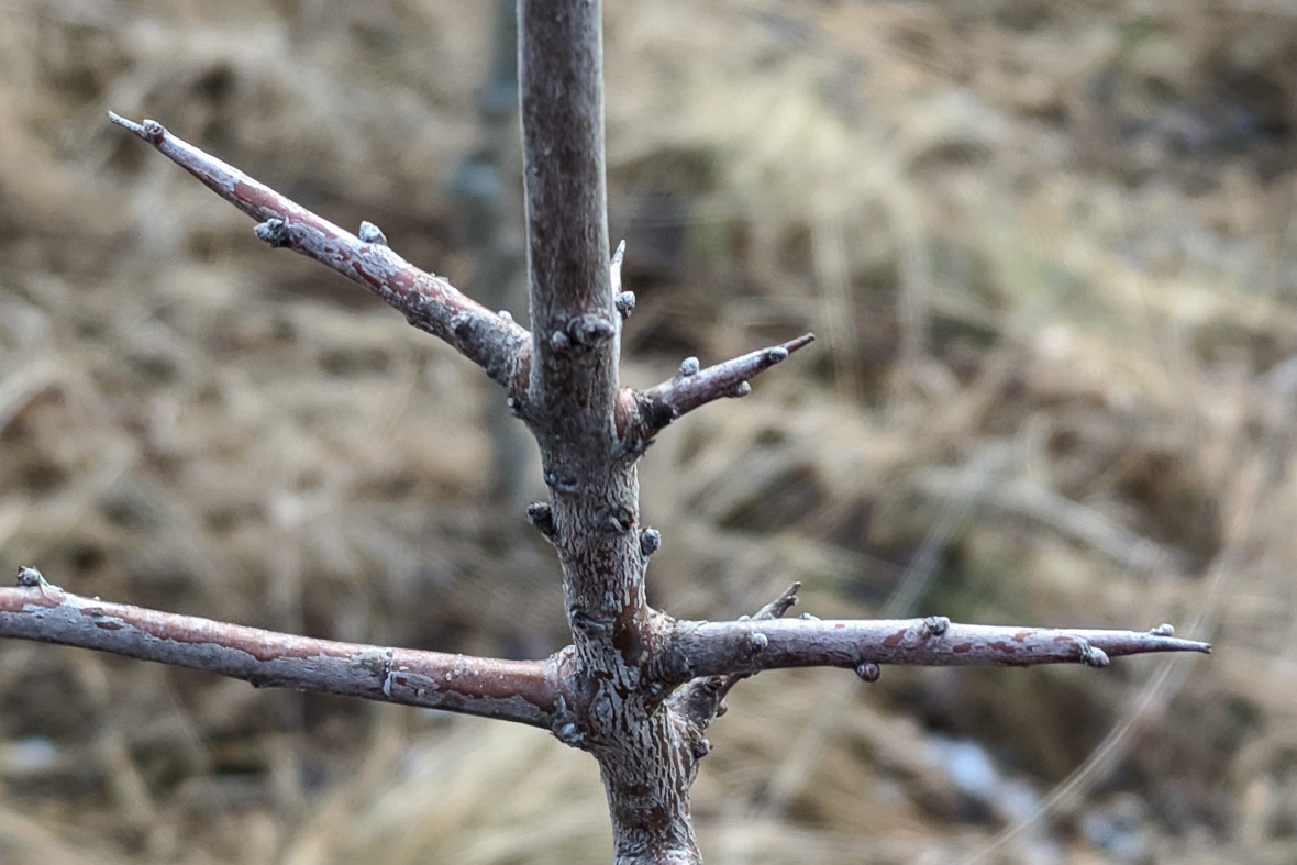 Megmutatom a képeket a vadalma, a vadkörte és galagonya tövises nyársáról, falusiasan tüskéjéről, és kérlek, szánj rá tíz percet, hogy megfigyeld, és leírd magadnak a következőket mindenikre külön: hol van rajta tövis, azaz szúrós valami, és hol vannak rügyek, illetve azok milyen irányba állnak. Ezekről a tövises nyársakról azt kell még elmondanom, hogy almástermésűeknél a vad fák jellemzői. Ha most kimennél a kertedbe, és keresnéd az alma- vagy körtefákon, nem találod őket, mert a nemesen a termőnyársak nem tövisesek. A kajszin van esélyed találni tövisesebb nyársat, vagy egyik-másik vadabb szilván, de almán és körtén nem igazán.
