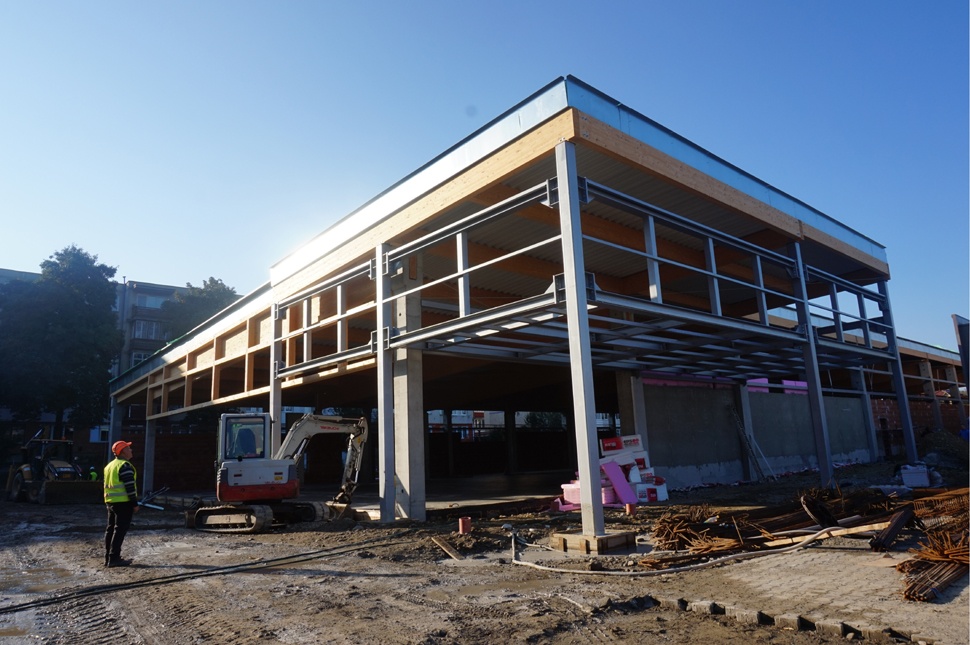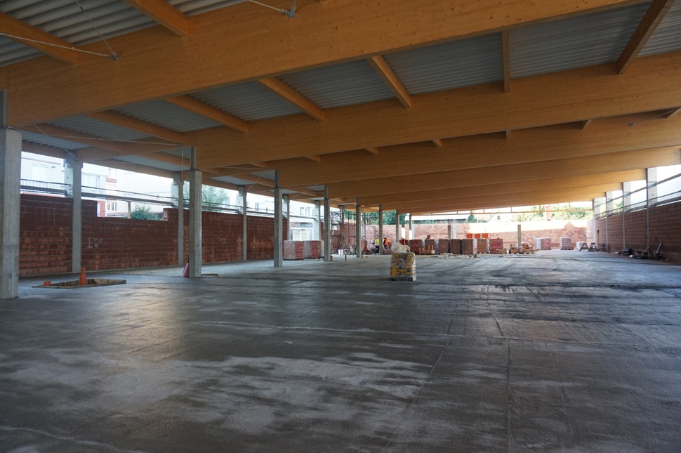 a mennyezetre hívják fel a figyelmünket, már most is láthatjuk, ez hogyan fog kinézni a nyitás után. A régi Lidltől eltérően ez most nem marad egy álmennyezet takarásában, „szerelések, lámpatestek, légkondicionáló rendszer lesz, de maga a gerendázat, az így, ahogy van, látható lesz".