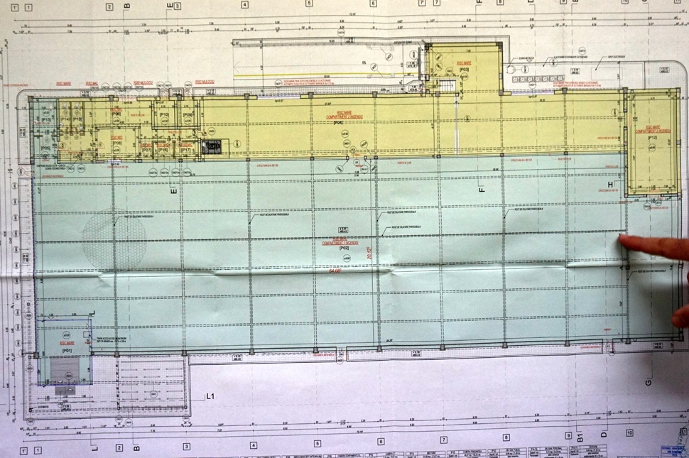rögtön a tervek fogadnak a falon, el is mutogatja nekünk, mi hol lesz az új épületben. „Lényegi változás nem lesz, pont úgy fog kinézni, ahogy eddig, csak sokkal nagyobb lesz, és a pékáruk ide, hátra kerülnek" – magyarázza. A tervrajzon a sárga színű részek a raktárrészt jelölik, a zöldek a „vásárlók játszóterét".
