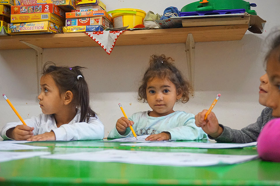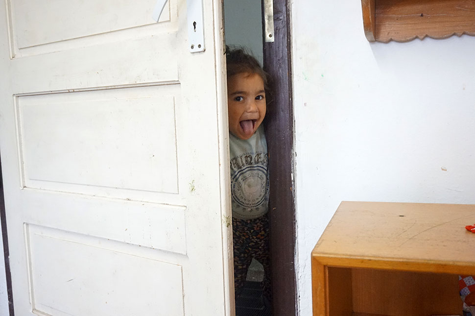 A teremben egy asztal körül ülnek épp a csöppségek, rajzolgatnak valamit, és kíváncsi, kicsit gyanakvó tekintetekkel fordulnak felénk, ahogy belépünk.