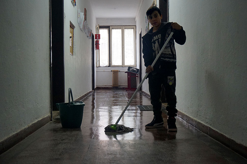 Az ajtó előtt először a 12 éves Jánoskával találkozunk, ő már nem óvodás, csak az édesanyjának segít a takarításban. Minden nap. Az ő feladata a folyosó feltörlése. Gyakorlott mozdulatokkal, vidáman végzi a dolgát.