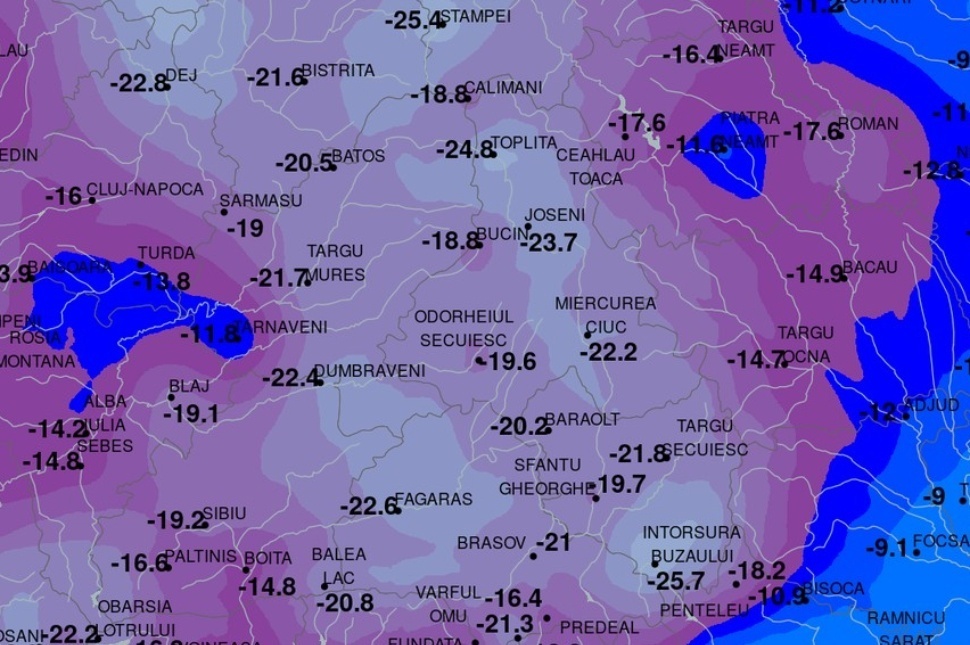 Udvarhely sem maradt el sokkal, a Meteo România térképe alapján szinte mínusz húszig zuhant a higanyszál, és csak a nap kisütésével kezdett lassan kúszni felfelé.