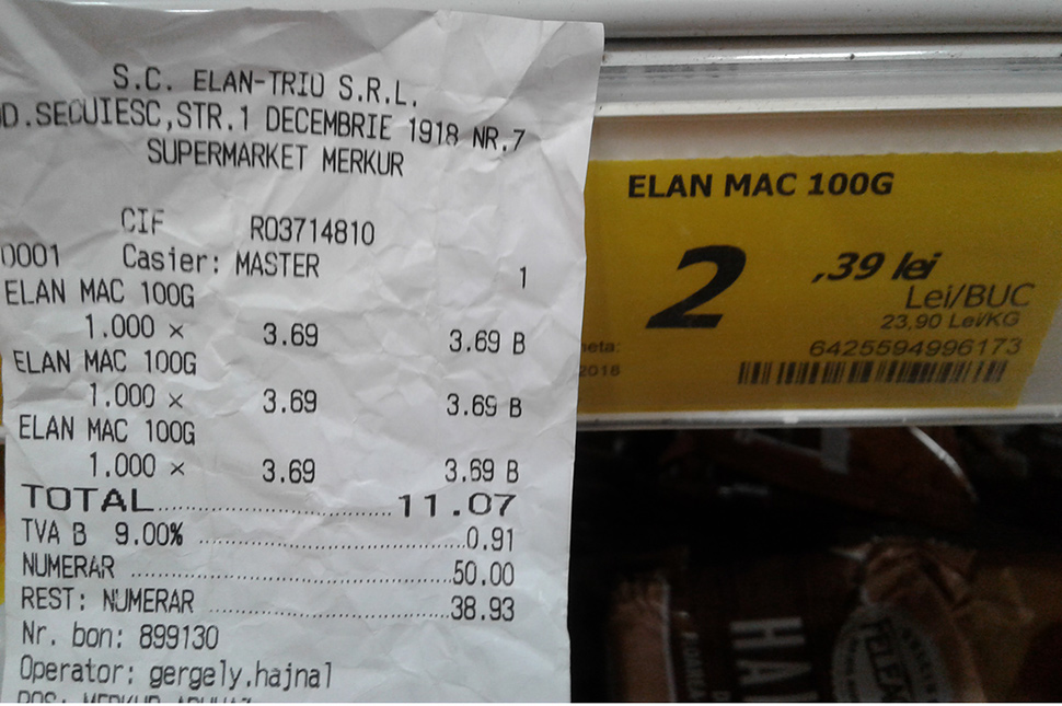 Ahogy a kasszát elhagytuk, gyanúsnak tűnt nekem, hogy 100 lej fölött vásároltunk, ezért ránéztem a kasszaszalagra. Nem lepődtem meg nagyon, mikor láttam, hogy a humuszt ismét dupla áron számolták fel nekem, 3,75 helyett 7,49-be került. Ez már ilyen hagyomány itt a Kauflandban.