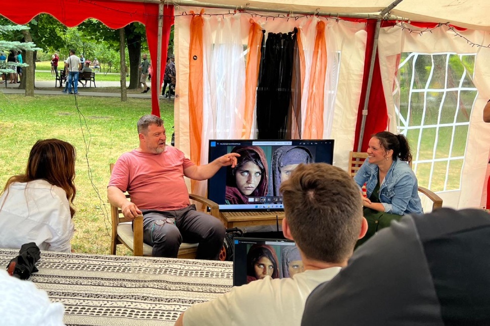 A képeken a világítás is tetten érthető, mondja Karcsi, majd a National Geographic Afgán lány című 1984-es címlapfotóját kezdi elemezni: