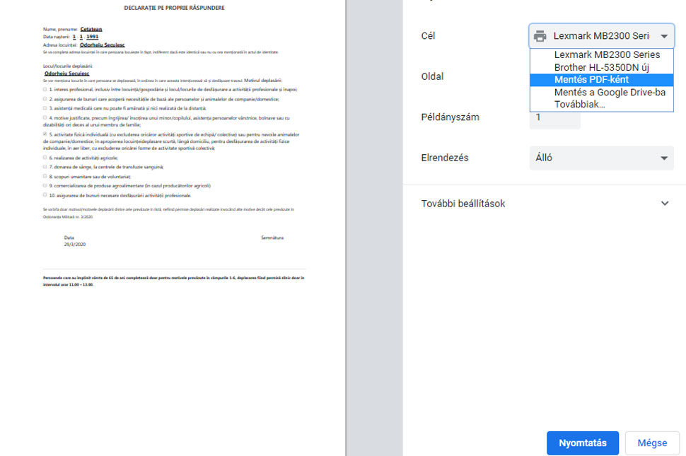 Az űrlap kitöltése után a Generează Declarație gombra kattintva máris ki lehet nyomtatni vagy PDF-ként menteni a dokumentumot.