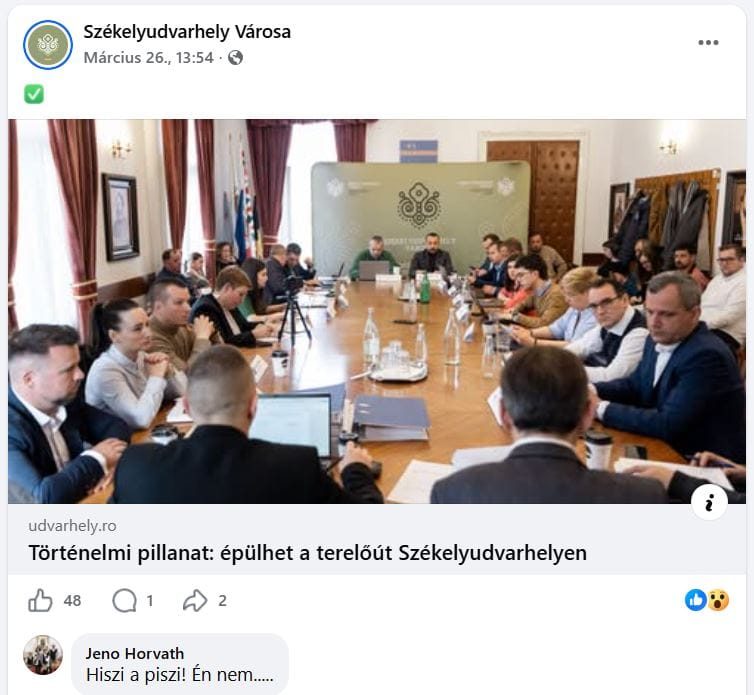 A városháza oldalán hangzatos címet adnak a tanácsülésről írt tudósításnak. „Történelmi pillanat: épülhet a terelőút Székelyudvarhelyen.”