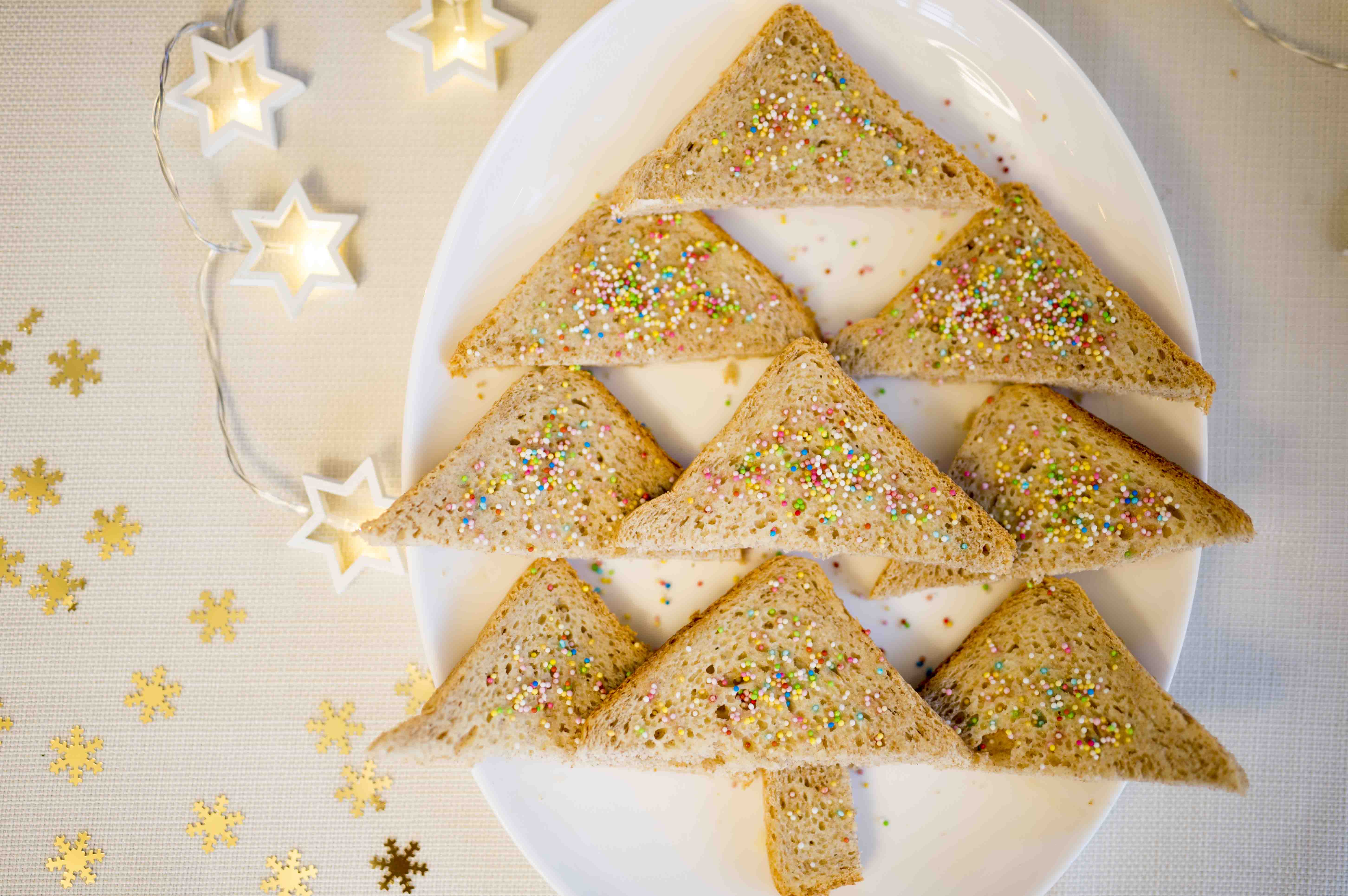 A toast kenyeret félbe vágjuk. Megkenjük olvasztott vajjal. Megszórjuk színes cukorkákkal, majd karácsonyfa alakzatban egy tanyérra helyezzük. Kész is. Nem, tényleg nem vicc.