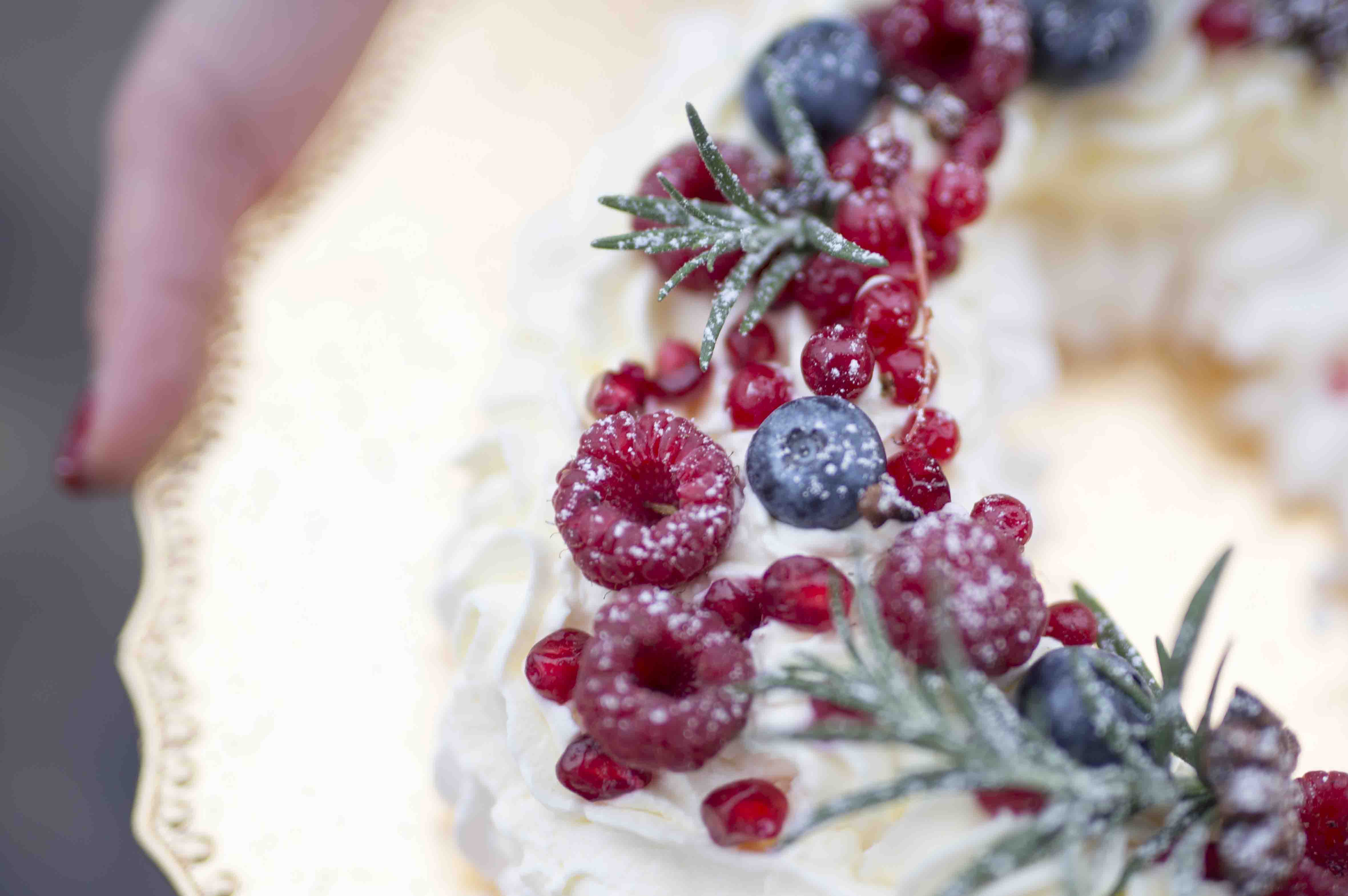 A tojásfehérjét a cukorral kemény habbá verjük, a végén hozzáadjuk az ecetben elkevert keményítőt. Halmozzuk úgy egy sütőpapírra, hogy koszorú formát kapjon. 100-110 fokos sütőben kb egy óra alatt kiszárítjuk. Hagyjuk jól kihűlni, mielőtt megpróbálnánk levenni a papírról, mivel nagyon érzékeny a massza, könnyen törik. A tejszínből, a krémsajtból, a porcukorból és a vaníliából habot verünk, ezt a habcsókkoszorú tetejére nyomjuk. Gránátalmával, friss málnával, áfonyával, rozmaringgal, csillagánizzsal és fahéjrúddal díszítjük. Végül pedig hintsük meg egy kis porcukorral, így tényleg olyan lesz, mintha magát a havas karácsonyt tennénk az ünnepi asztal közepére.