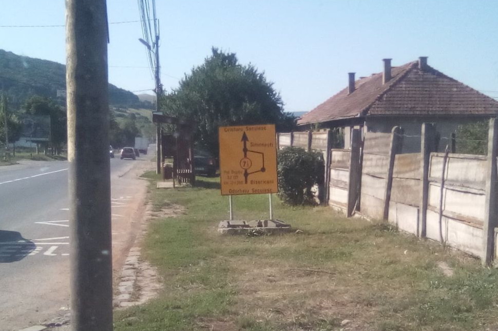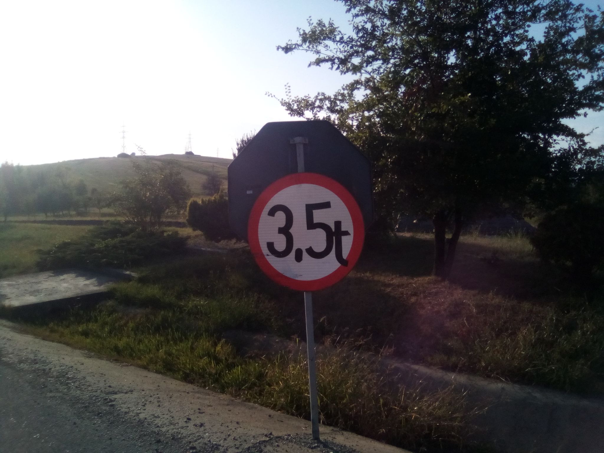 Újabb korlátozásba botlanak. Ez már akkora autót sem enged Keresztúr felé, mint az udvarhelyi tiltótábla. Csupán a 3,5 tonna összsúlyú tehergépkocsik térhetnek le. Tehát a legközelebbi útvonal Székelyudvarhelyről Keresztúrra a 7,5 tonnánál súlyosabb autó számára Szováta-Balavásárhely-Segesvár-Héjjasfalva útszakasz megtétele jelenti. Valakinek nem tetszik ez a korlátozás: egyszerűen elfordította a STOP táblát a mező irányába.