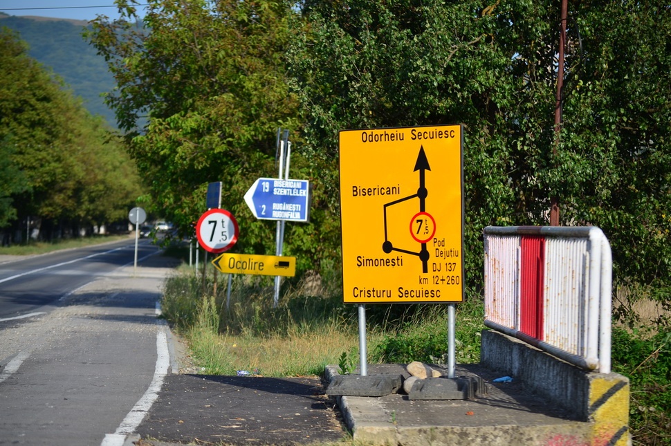 Meg pár méterrel mellette, a Betfalva-Székelyudvarhely irányába vezető út mellett ott van a másik tiltótábla is. Ez azt jelenti, hogy ha valaki 7,5 tonna összsúlyú autóval szeretne megtenni Keresztúrról egy 25 kilométeres utat Székelyudvarhelyre, legálisan nem teheti meg. A nyikómenti és a küküllőmenti útszakasz is zárva van előtte. Helyette csakis a Segesvár-Balavásárhely-Szováta útszakaszt választhatja, ami körülbelül 140 kilométer.