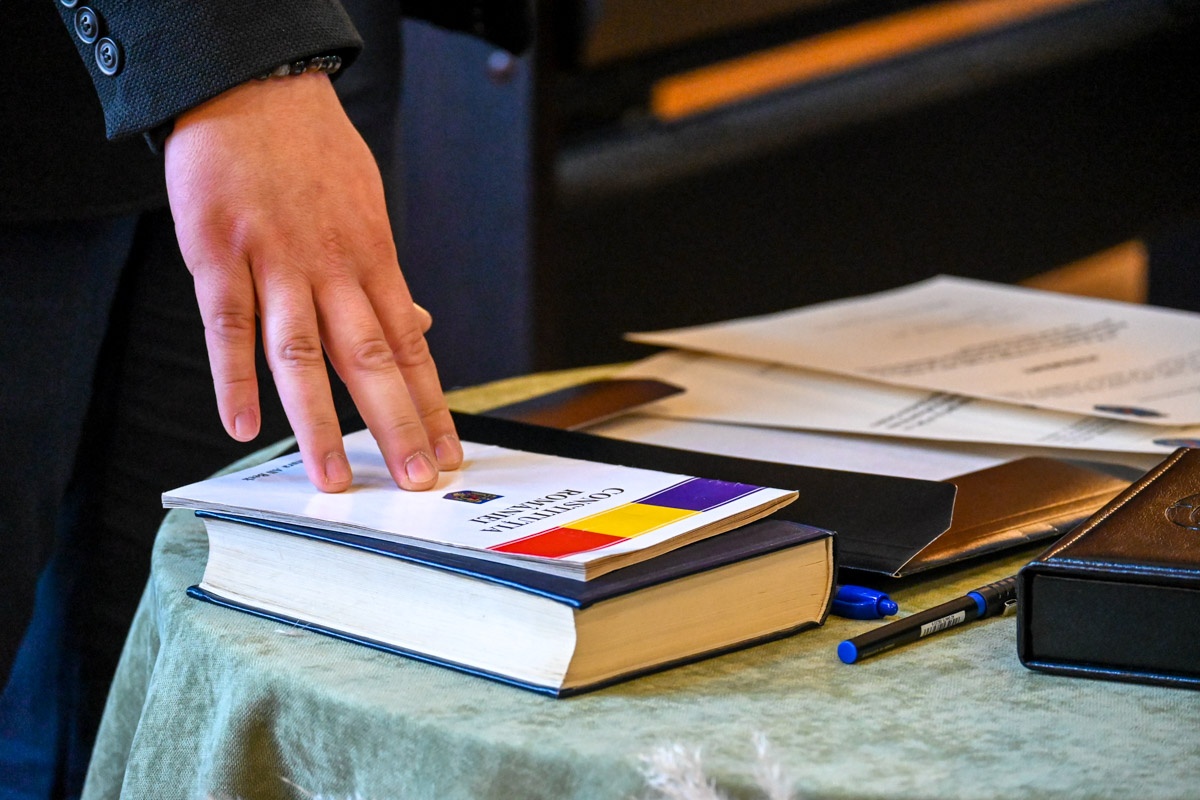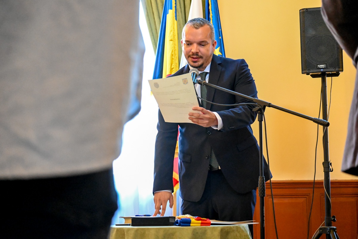 Az eljárást ismertetik újból: a főjegyző felolvassa az eskü szövegét, a polgármester pedig leteszi a hűségesküt román nyelven az önkormányzati képviselőkhöz hasonlóan.