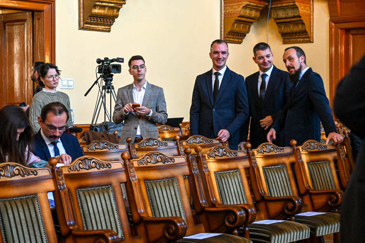 A jegyző köszönti a jelenlevőket. Megkér, hogy álljunk fel a román himnusz eléneklésére. Itt vannak az új polgármester szülei is, -- fedezzük fel --, a korábbi tanács tagjai, mint Pálfi Kinga, Godra Zsolt, Péter Balázs, Becze Juliánna, a városháza munkatársai és meglepetés: Hont András, magyarországi újságíró is a közönség soraiban van. Valószínűleg Schiffer András esti könyvbemutatója előtt vesz egy kis szagmintát az udvarhelyiekből.