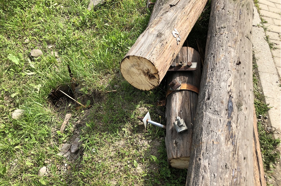 A helyszínen délután 4 körül még láthattuk a kreatív megoldást, és hogy a többi faoszlop sem túl stabil, kicsit lennebb a másik oldalon már a támasztékjával együtt készül kidőlni, ha szerencsénk van, nem a mellette álló székely kapura.