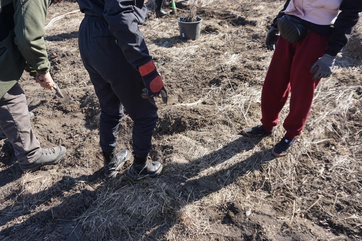 „Megmutatom, jó-e, hogy hogy kell?” – és kapával a kezében nekilát. Ránkszól, hogy nem szeretne holnap-holnapután elhullatott csemetéket látni a helyszínen. Megkérnek, egy lyukba csak egy csemetét helyezzünk, és ne szemeteljünk.