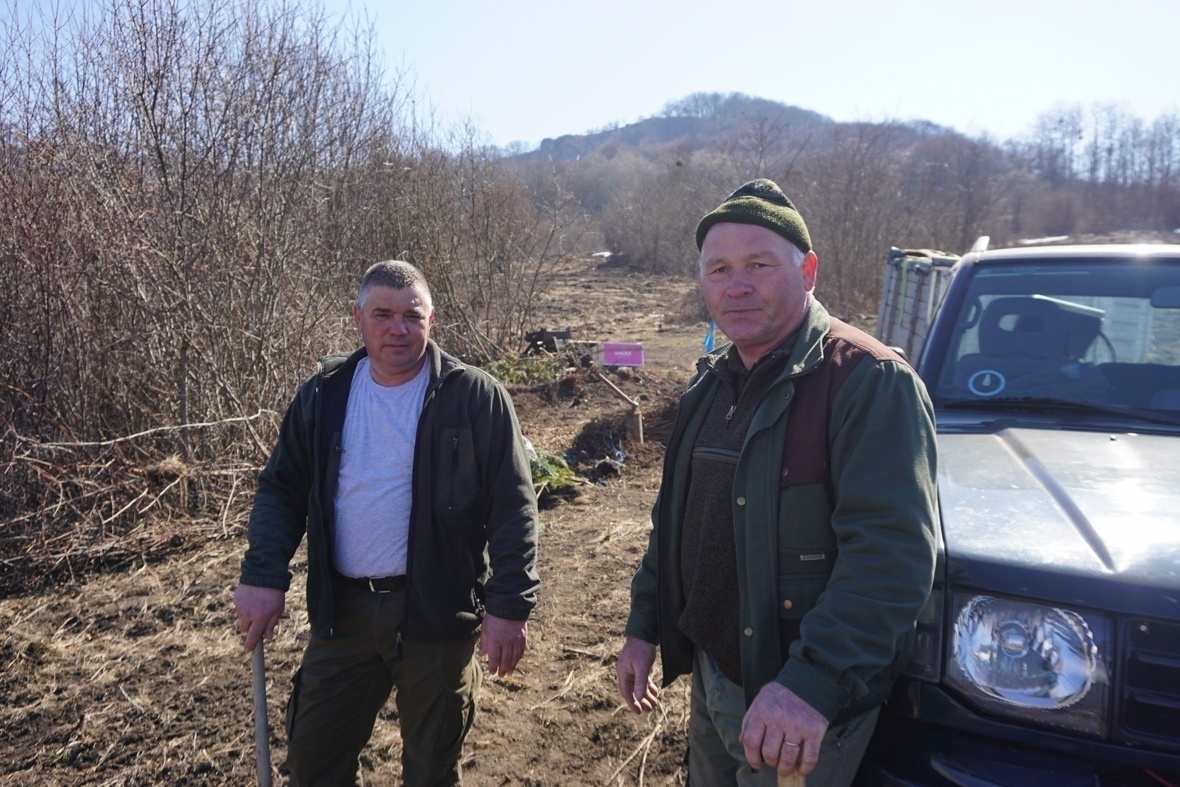 A Kovászna megyei csemetekertből származó, 2-3 éves cserefácskák között manőverezve a telek sarkába veszem az irányt, ahol négy tanár gürizik.