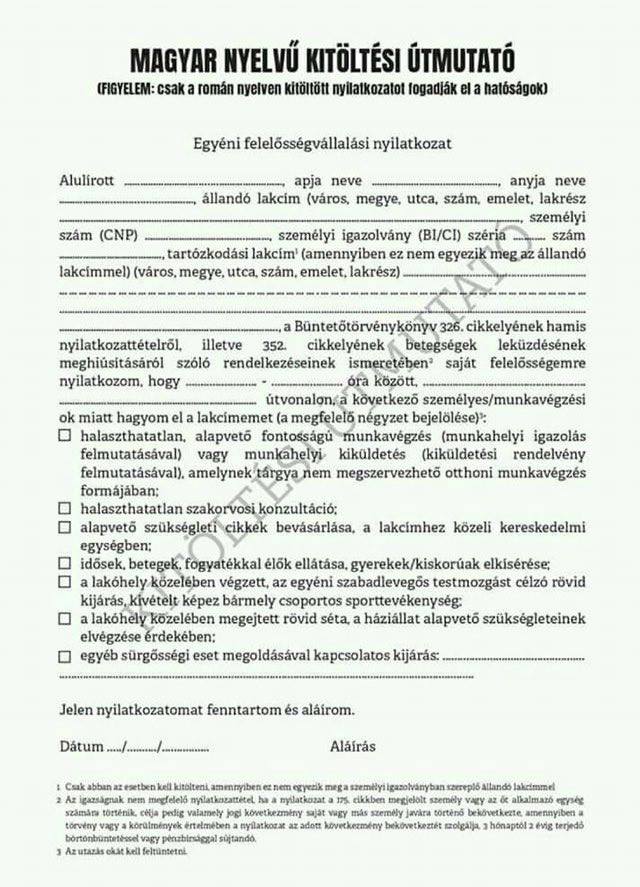 Alább van egy magyar nyelvű kitöltési útmutató. Figyelem, a hatóságok csak a román nyelvű űrlapot fogadják el, ez csak azért van, hogy könnyebben ki lehessen tölteni a román nyelvű űrlapot.
