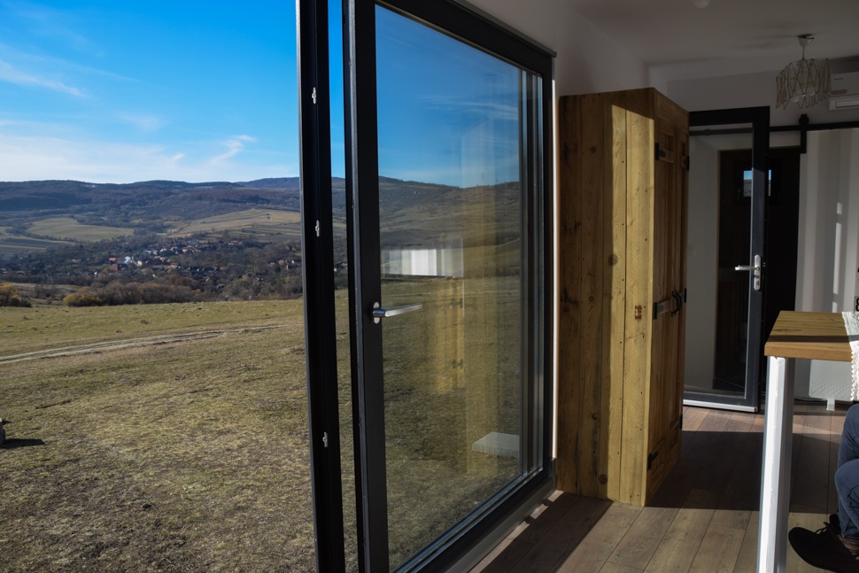Közben valaki megjelenik a dombon, és a házat veszi célkeresztbe. Amikor közelebb ér, alaposan szemügyre veszi az újdonságot. A promo videó forgatását folyton megzavarták a kíváncsiskodók, emlékszik vissza Mária, de nem tűnik dühösnek miatta, sőt, inkább büszkeséget látok az arcán. Pedig mondhatni a semmi közepén van, csak találomra választotta a helyet, felment a dombra, pont akkor ment le a nap, és akkor elhatározta, hogy a konténernek itt a helye, magyarázza nevete, még azt sem tudták, hogy kié a telek, a közbirtokosságnál derült ki.