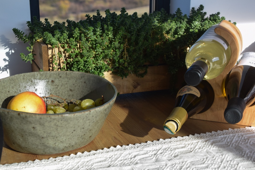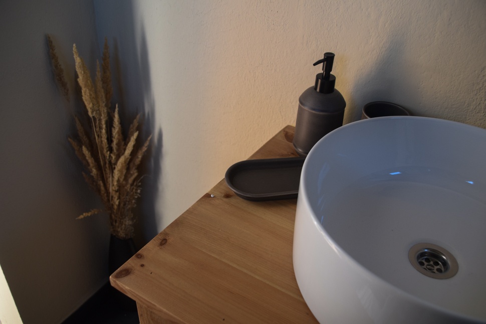 „Fontos szempont volt, hogy újrahasznosított legyen”, zavarja meg a csodálkozásomat Precub Mária. A felhasznált hajókonténer közel tíz éves. A nyílászárók kivágása után maradt részeket is felhasználták, fürdő- és hálószobaajtó lett belőlük, sőt, még az asztal alsó része is ebből az anyagból készült.