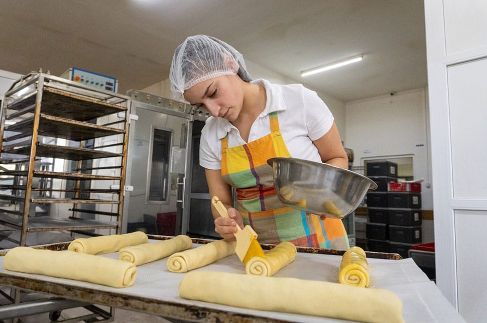 Tucatnyi hölgy sürög-forog a kemencék, hűtők, mixerek és más berendezések labirintusában. Vannak, akik a különféle péktermékeknek és szárazsüteményeknek gyúrják és nyújtják a tésztát, vagy éppen formára vágják azt, ami már kész van.