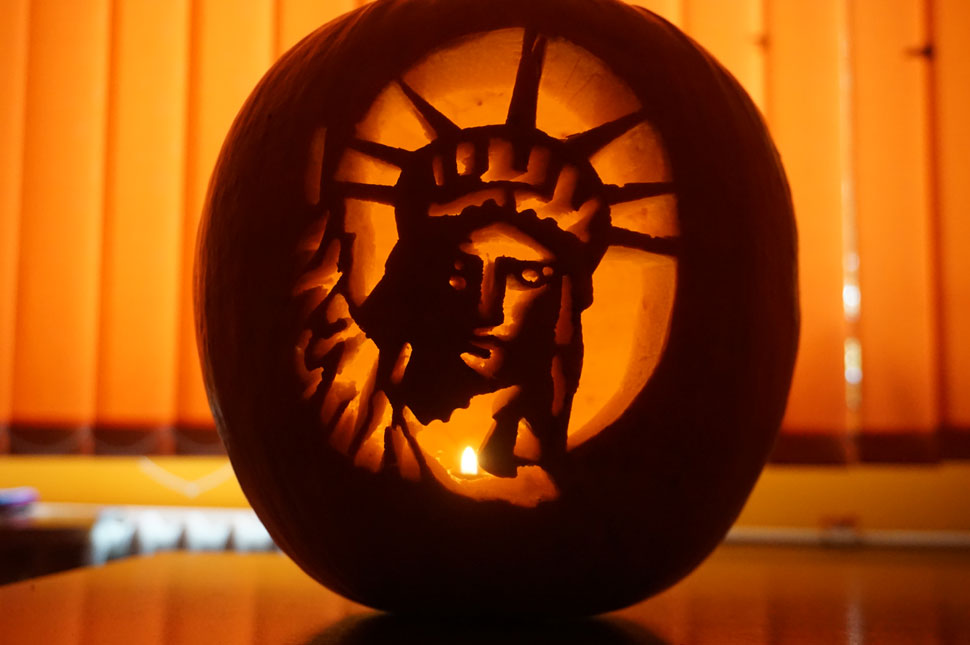Az egyik töklámpással be is vonulunk az igazgatói irodába, az igazgatóság szorgalmazza, hogy nézzem meg meggyújtva. „Apuka profi” – beszéljük meg, amikor kigyúl a gyertya a lesötétített irodába bevitt tök belsejében. „Azt sem tudjuk, hogy ki készítette, a nem verseny kategóriában volt kitéve és a zuhé a cetlit lemosta róla. Tavaly volt egy Mona Lisa, ugyanaz az apuka csinálhatta. Nagyokat szórakozhat otthon, nagyon aprólékos munka”, mesélik.