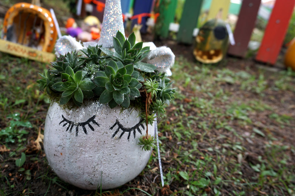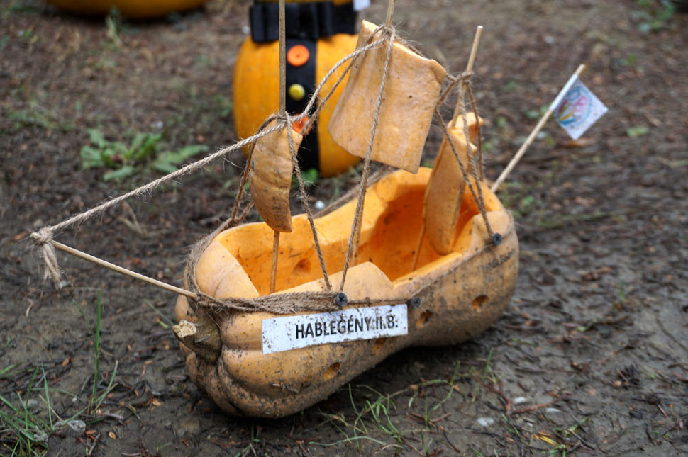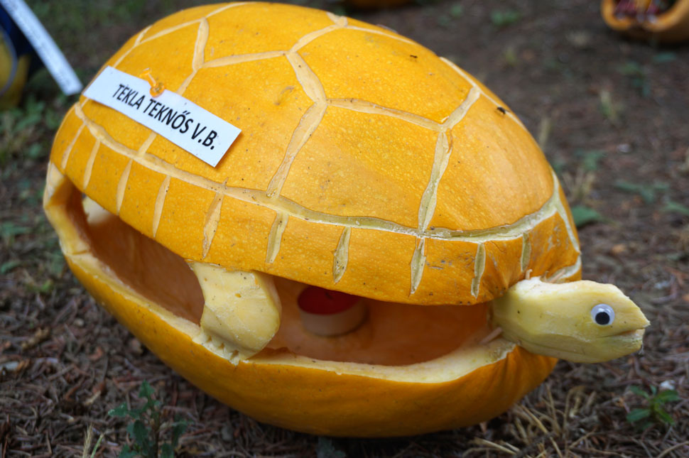 Sok-sok állatot ábrázoló töklámpás van, ilyen a fentebb látható Tekla Teknős, aki a harmadik helyen végzett. Holtversenyben például azzal a tökkel, amit élő virággal díszítettek fel, ezt majd át is tervezik ültetni az iskola udvarára.