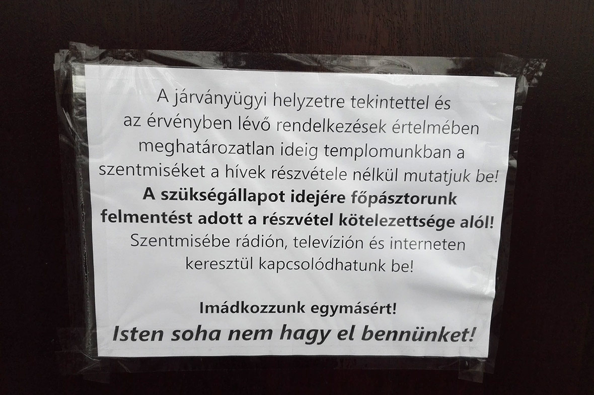 10 óra Épp harangoznak. A miséket és istentiszteleteket legtöbb helyen hívek nélkül tartják meg, vagy elhalasztják. Az alábbi kép Keresztúrról érkezett, a katolikus templom ajtajára kiragasztott felirat látható rajta.