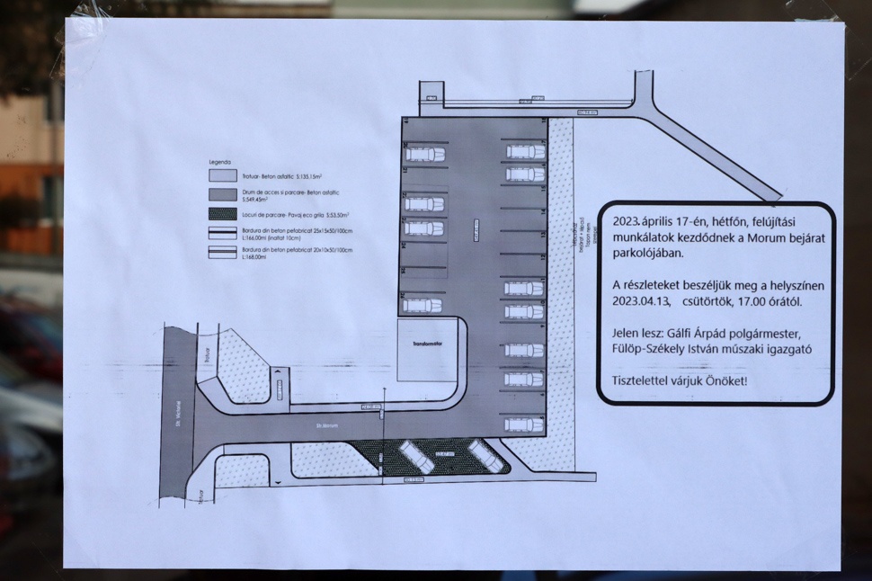 Lakossági fórumot tartottak csütörtökön, április 13-án Gálfi Árpád polgármester és a székelyudvarhelyi városháza műszaki igazgatóságának munkatársai a Bethlen-negyedi Morum bejáratban: egy héttel a fórum után, április 20-án elkezdődnek a javítási munkálatok a helyszínen. Ekkortól kérik felszabadítani a területet, hogy a kivitelező zavartalanul elkezdhesse a munkálatokat. A csütörtöki fórumon is bemutatott terveket 2023 januárjában közölte odalán a városháza.