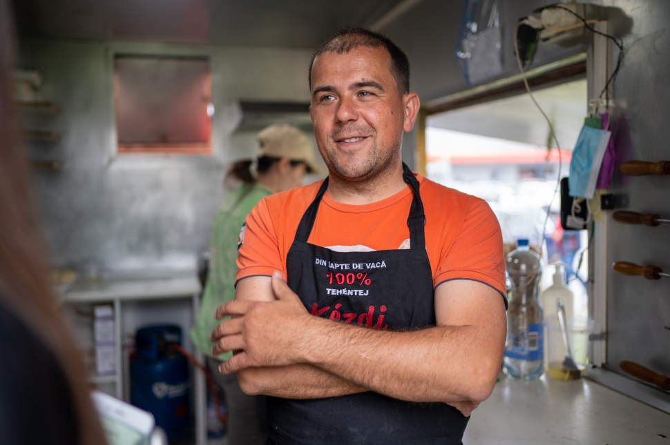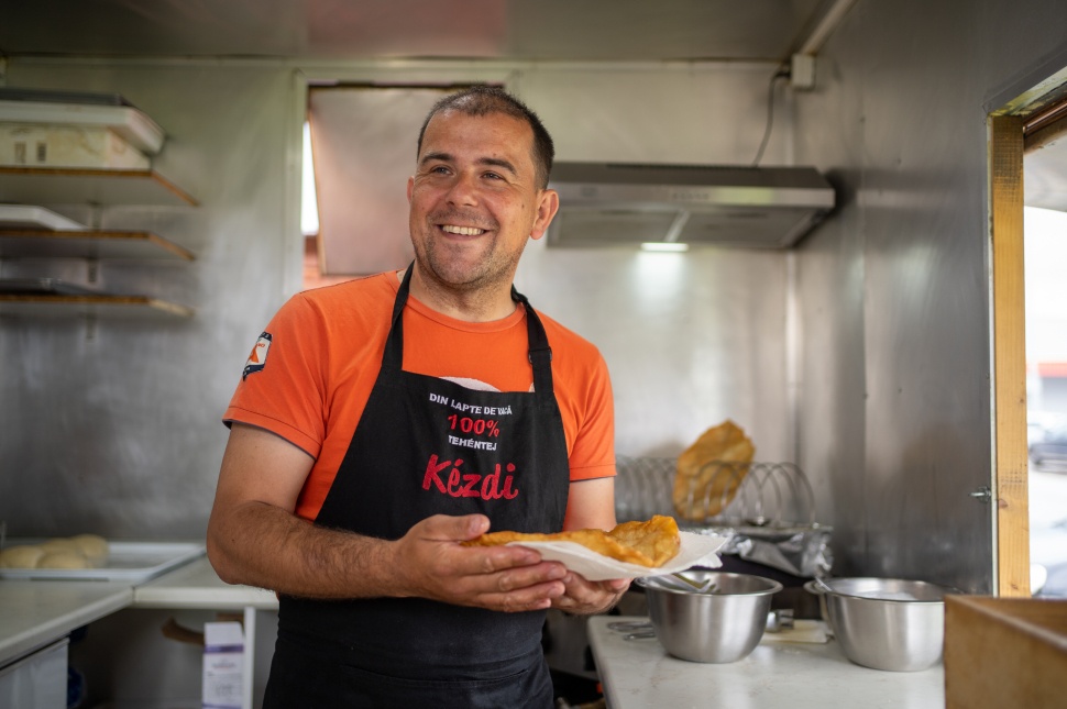 Zápor után érkezünk Kézdivásárhely egyik áruházának parkolójába, mely tavaly június óta állandó helyszíne a kézdiszentléleki születésű Szabó Csaba és családja kürtőskalács- és lángossütő büfékocsijának. Ahogy kiszállunk az autóból, az esőillatot rögtön felváltja az összetéveszthetetlen, édeskés, olajszaggal keveredett illat: a kürtőskalács és lángos egyvelege.