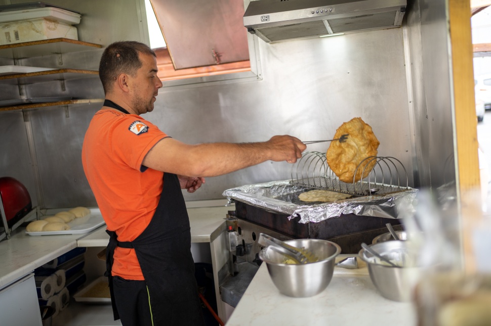 – Van egy Bákó megyei család, akik minden második héten erre jönnek – meséli Csaba. Ők már nem is jönnek ide a kocsihoz, elmennek bevásárolni és előtte intik messziről, hogy kettőt vagy hármat kérnek, mi pedig már tudjuk, hogy jó piros sajtos-tejfölös-fokhagymás lángos lesz.