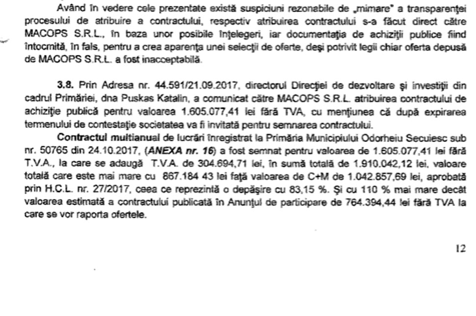 Azt állítják benne, már a közbeszerzési eljárásban szabálytalanságok voltak: három cég jelentkezett az elektronikus közbeszerzési eljárásra a megszabott időpontig, vagyis 2017. május 19-ig, hogy elvégezné a 764 ezer lej körüli munkálatokat. Ezek egyike sem a Macops Kft. volt.