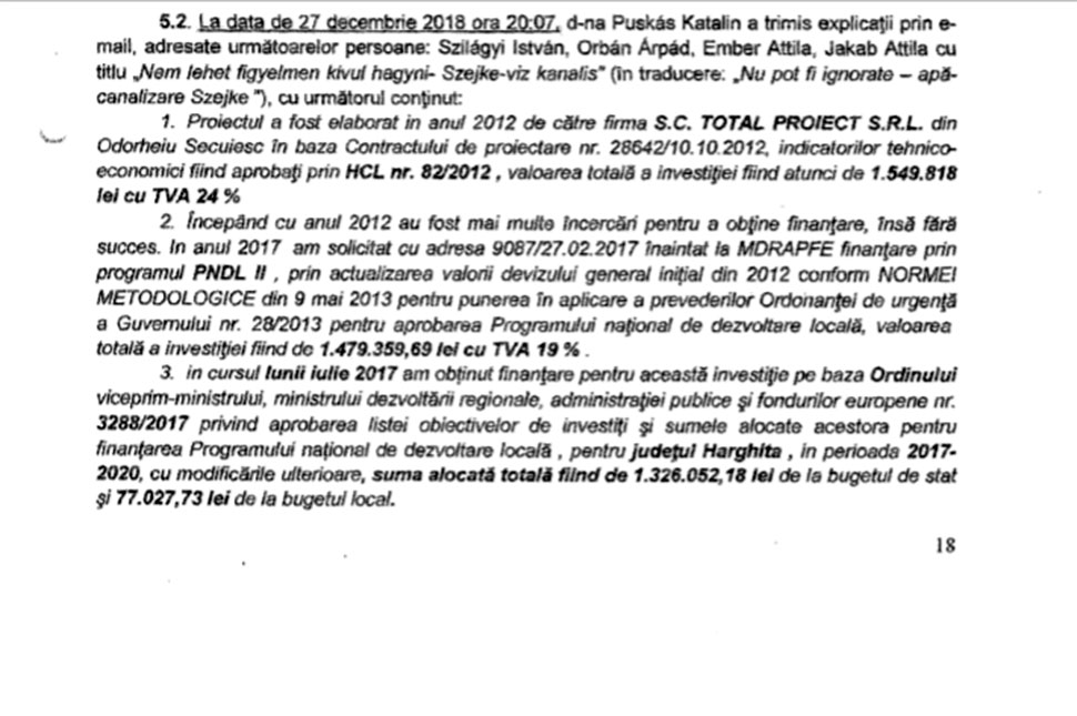 A számokat illetően azért gyanús a közbeszerzési eljárás mert a közbeszerzési folyamat ideje alatt a Puskás Katalin által vezetett igazgatóság jogtalanul megváltoztatta a 27/2017 számú helyi tanácsi határozattal jóváhagyott és az állami alapokból finanszírozott Szejkei víz- és csatornahálózat építési dokumentációját. A polgármester által is jóváhagyott, a SEAP-on publikált 764.395 lejre becsült szerződéssel szemben odaítélték a munkálatot a Macops Kft.-nek 1.605.077 lej plusz ÁFA értékben. Vagyis 110 százalékkal nagyobb összegről van szó, habár a törvény csak 15 százalékos értékingadozást enged meg. Mindezt olyan körülmények között, hogy a nyilvános dokumentumok alapján jogtalanul zárták ki azt a céget, amely 823.533 lejes ajánlatott tett a munka elvégzésére.