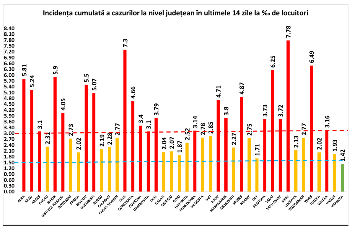 Ami a fertőzöttségi indexet illeti: Szeben megye áll az élen, az utóbbi tizennégy napban a lakosok 7,78 ezreléke fertőződött meg, Kolozs megyében 7,3, Temes megyében 6,49, és Szilágy megyében 6,23 ez a szám. Hargita megyének jelenleg 2,52-es a fertőzöttségi mutatója.