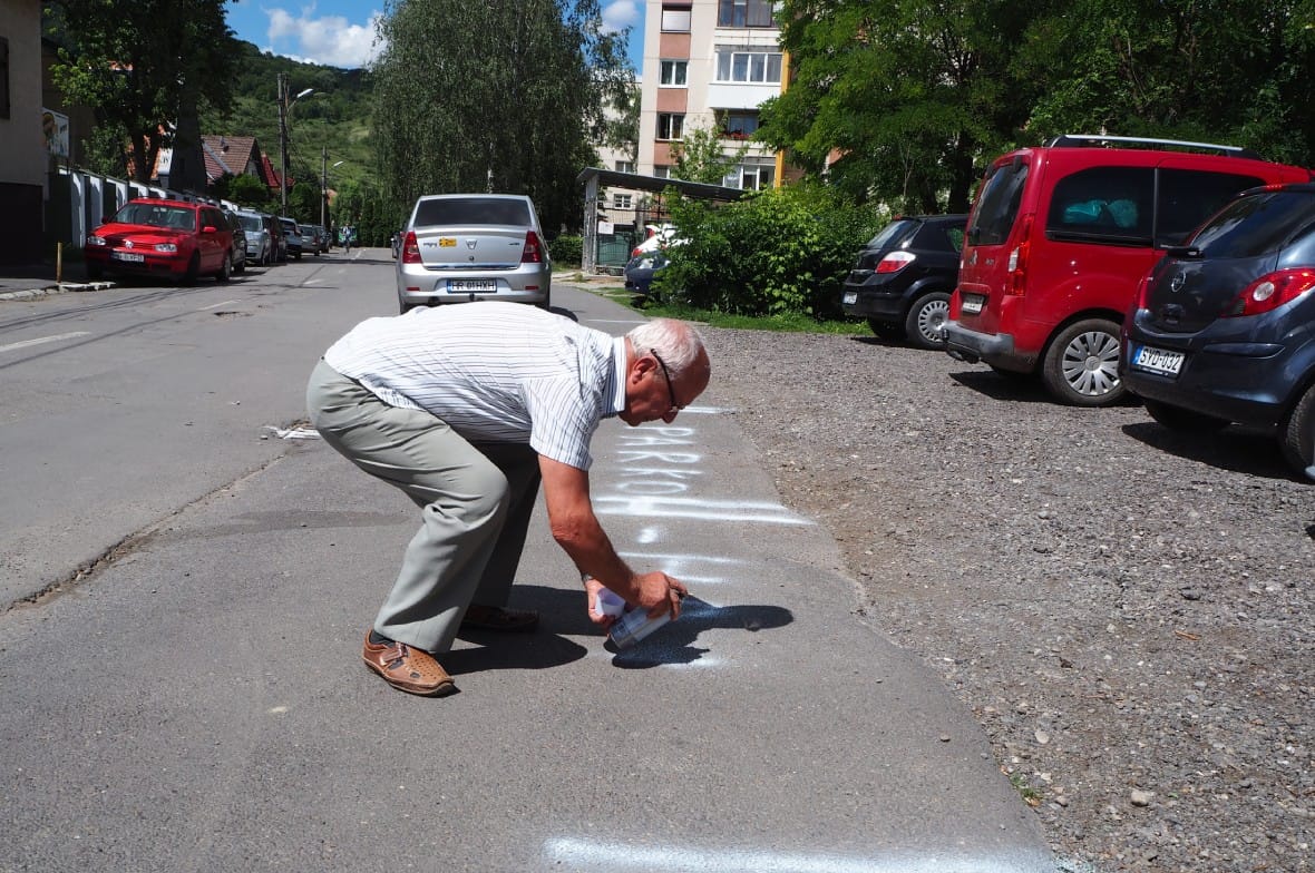 A Malom utcában különös dologra lettem figyelmes: egy bácsi graffitizte a parkoló előtt végighúzódó járdát. „Más is parkolhat” – festette fel, csupa nagybetűvel.