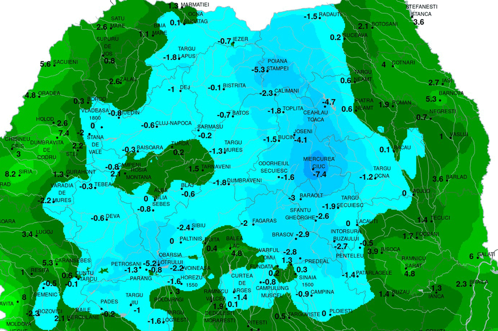 A Szentegyházi meteoállomás Facebook-oldalán közzétett térképen látszik, ahogyan a fagy ellepte az erdélyi megyéket, köztük Hargita megyét teljesen. Ezúttal is Csíkszeredában volt a leghidegebb, –7,4 Celsius-fokot mértek, a gyergyói medencében –4 körül, Udvarhelyszék központjában pedig –1,6-ot.