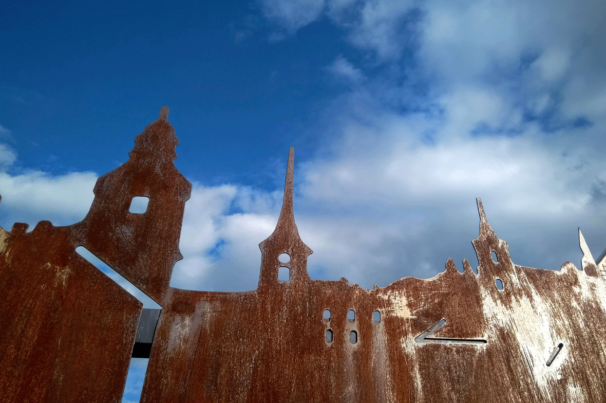 Még az „egészségügyi” sétáim során fedeztem fel ezt a rozsdásított kaput, ami városunk ikonikus épületeit ábrázolja. Egy kertes házhoz tartozik, megcsodálható a Csalókán, egészen pontosan itt.