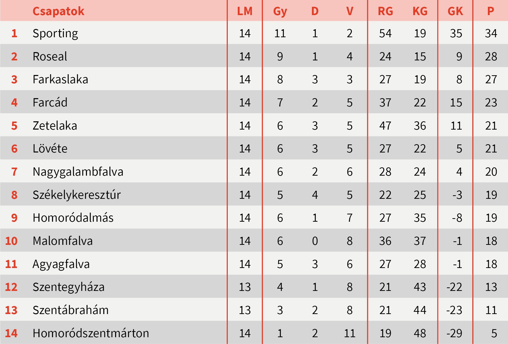 A Roseal továbbra is őrzi második helyét, de már csak egy pont az előnye a harmadik Farkaslakával szemben. Utóbbiak Lövétén szerezték meg a három pontot. A negyedik és a tizenegyedik helyek közt nagyon kevés pontkülönbség dönt a csapatok helyezéséről.