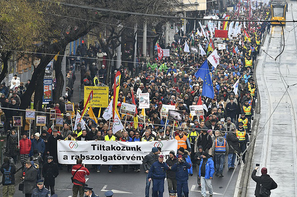 Vasárnap csúcsosodott az a tüntetéssorozat Budapesten, amely a december 12-i országgyűlési szavazást követően, az ún. rabszolgatörvény elfogadásának okán indult. Az Országgyűlés arról döntött, hogy a jelenlegi évi 250 túlórát 400-ra lehetne emelni, azaz akár minden szombaton elrendelhető lenne egy teljes munkanap ledolgozása, és csak három év elteltével kell kifizetni a túlórákat a dolgozóknak.