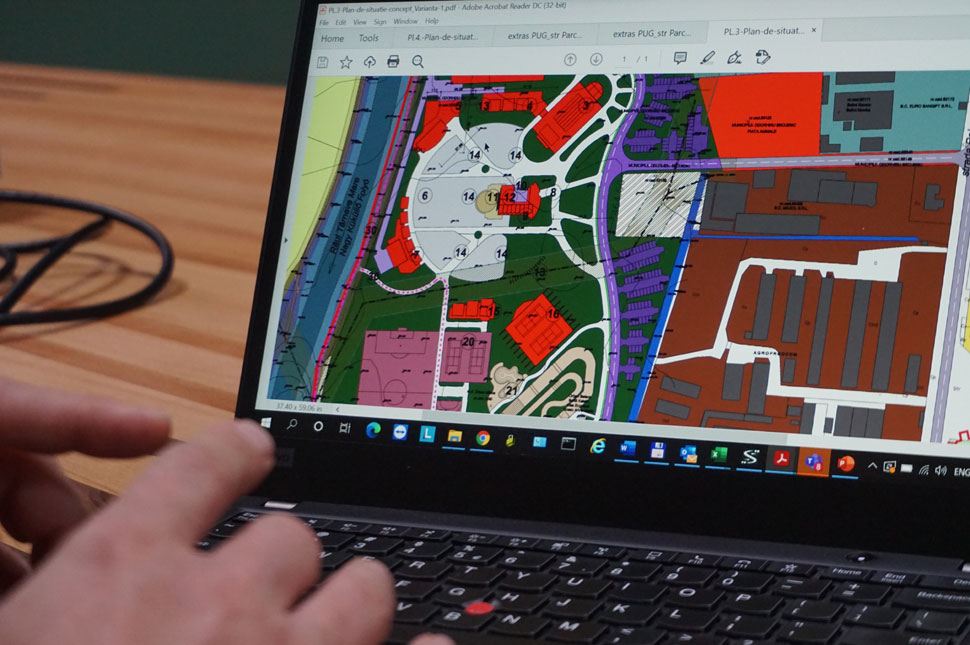 „A vörös rész a jelenlegi autóspiac, ide van elképzelve egy bekötőútja a területnek, és ahogy haladunk Boldogfalva irányába, lenne egy másik, nem pontosan a Jézus Szíve kápolnánál, hanem egy kicsivel lennebb” – vezet körbe virtuálisan. Szerinte itt szükség lenne egy helyszínre, ahol szabadtéri rendezvényeket úgy meglehessen szervezni, hogy az a város forgalmát ne állítsa fejre. „A Patkóban szervezett kézműves vásártól kezdve a szabadtéri koncertekig mindenre gondolok itt” – magyarázza.