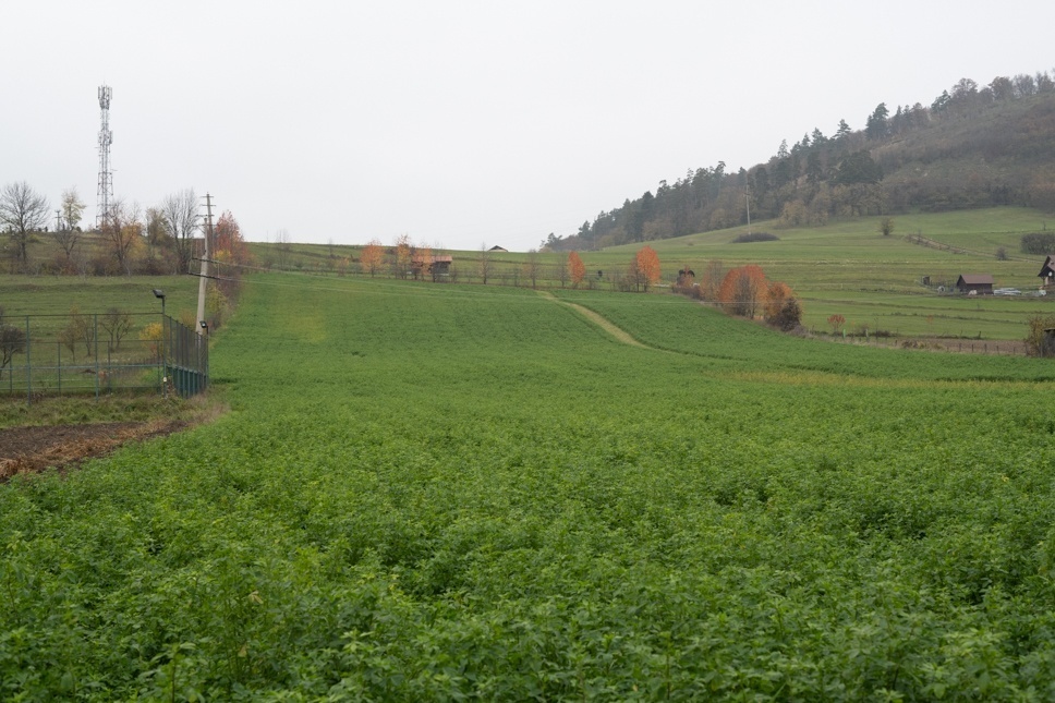 A teniszpálya mögötti mezőgazdasági terület.