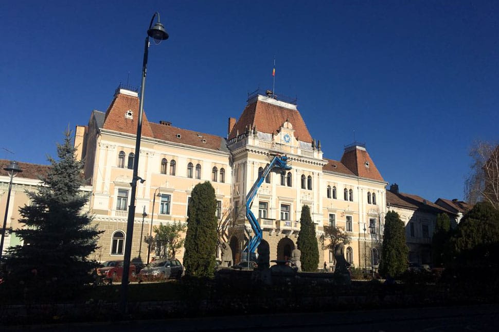 Nehéz nem észrevenni a kék darut, ami a városháza homlokzatára emeli a munkásokat, ezért Jakab Attila városmenedzserhez fordultunk, hogy mit lehet tudni az éppen zajló munkálatokról.